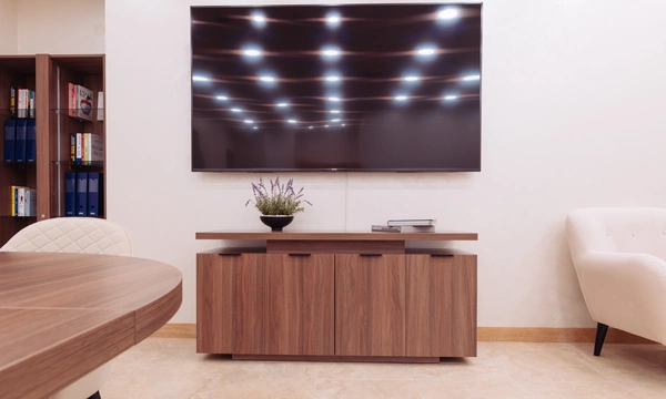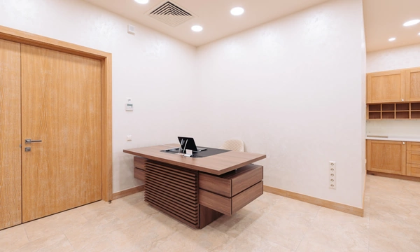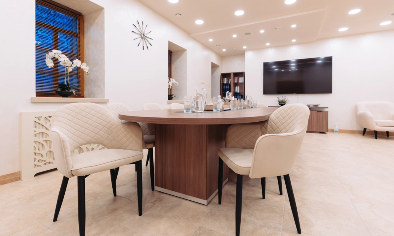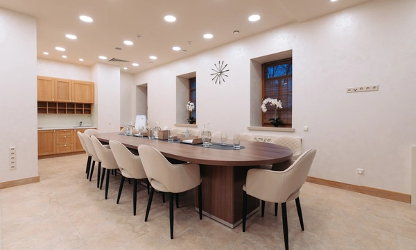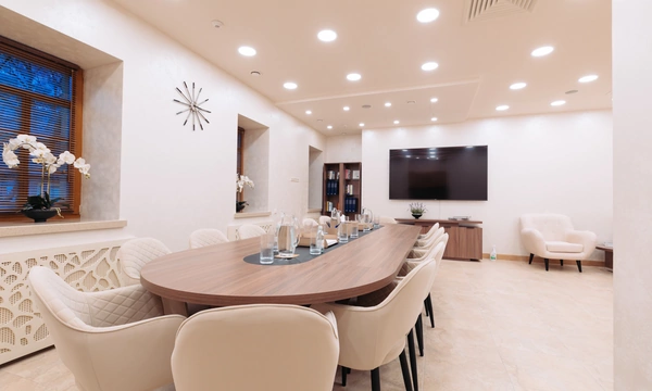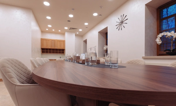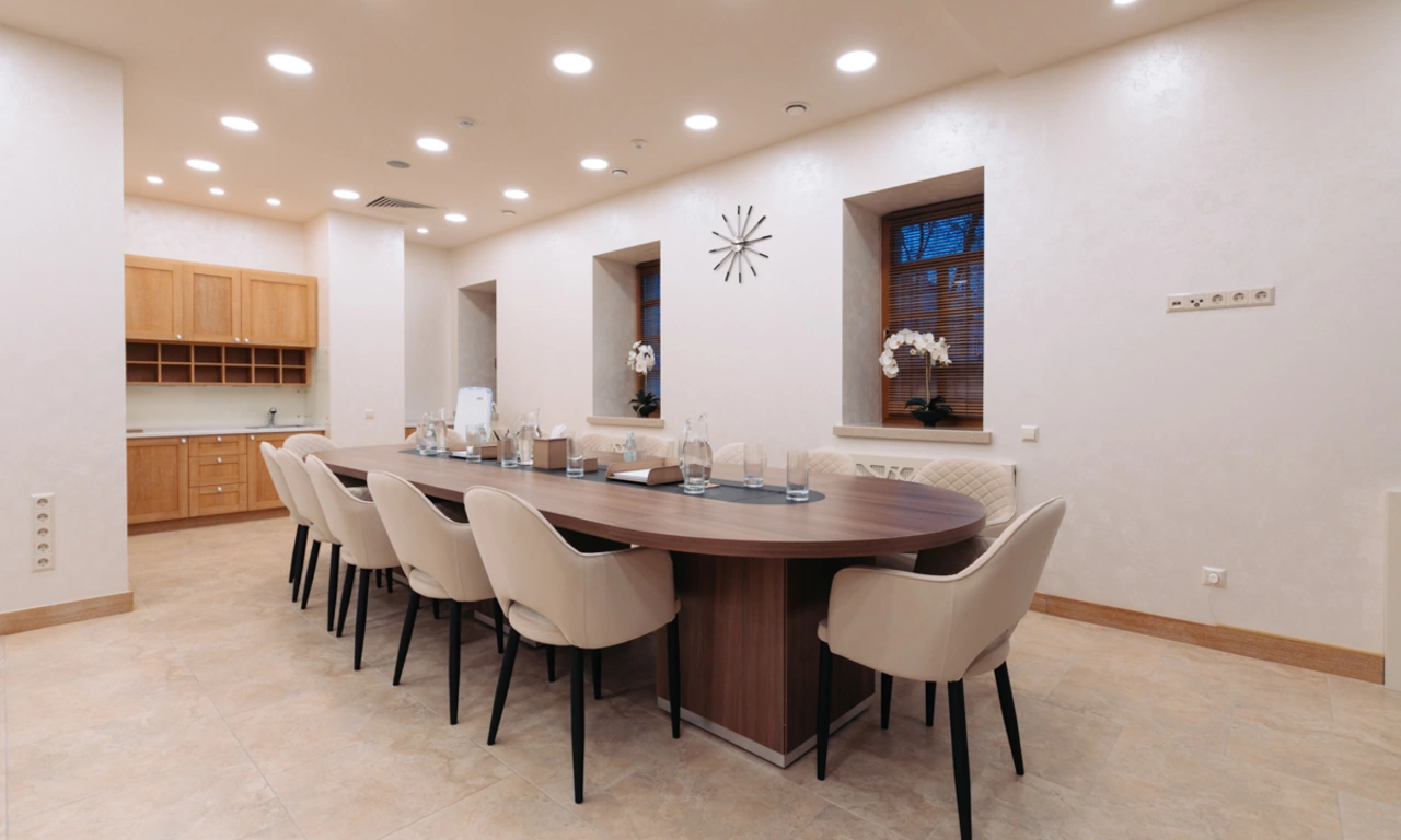 Медицинская клиника в центре Москвы, пожелавшая остаться неизвестной, обратилась к нам с целью оборудовать большую просторную переговорную комнату с кухней, зоной работы секретаря, мягким уголком для ожидания и переговорным столом, вмещающим до пятнадцати человек. Нашей задачей в этом проекте был подбор, поставка и монтаж корпусной мебели.