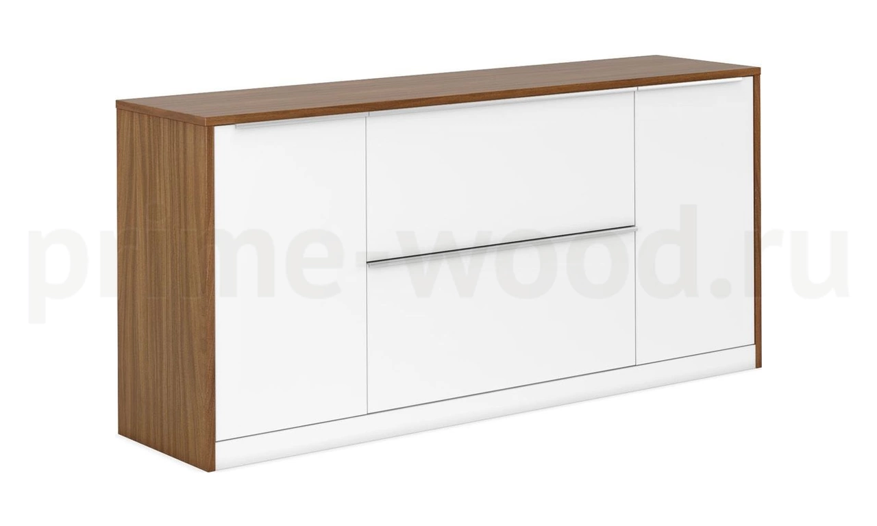 Низкий шкаф, 2 белых глянцевых двери, 2 файловых ящика, ручки - алюминиевые. Внутренняя часть шкафа - белая.