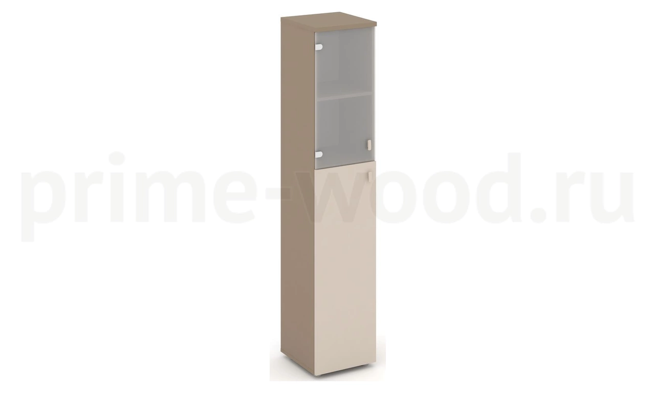 Шкаф высокий узкий левый (1 средний фасад ЛДСП + 1 низкий фасад стекло сатин матовый)