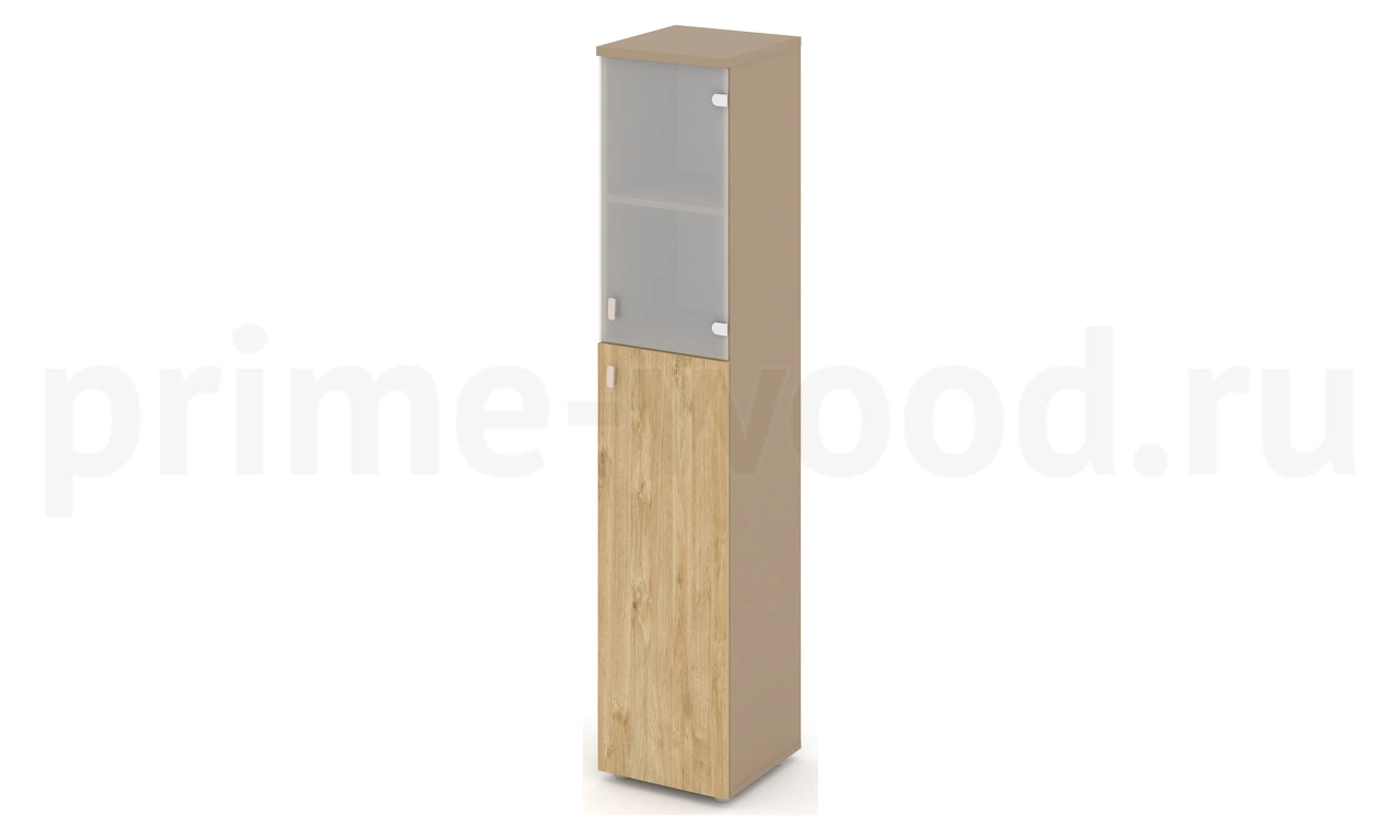 Шкаф высокий узкий правый (1 средний фасад ЛДСП + 1 низкий фасад стекло сатин матовый)
